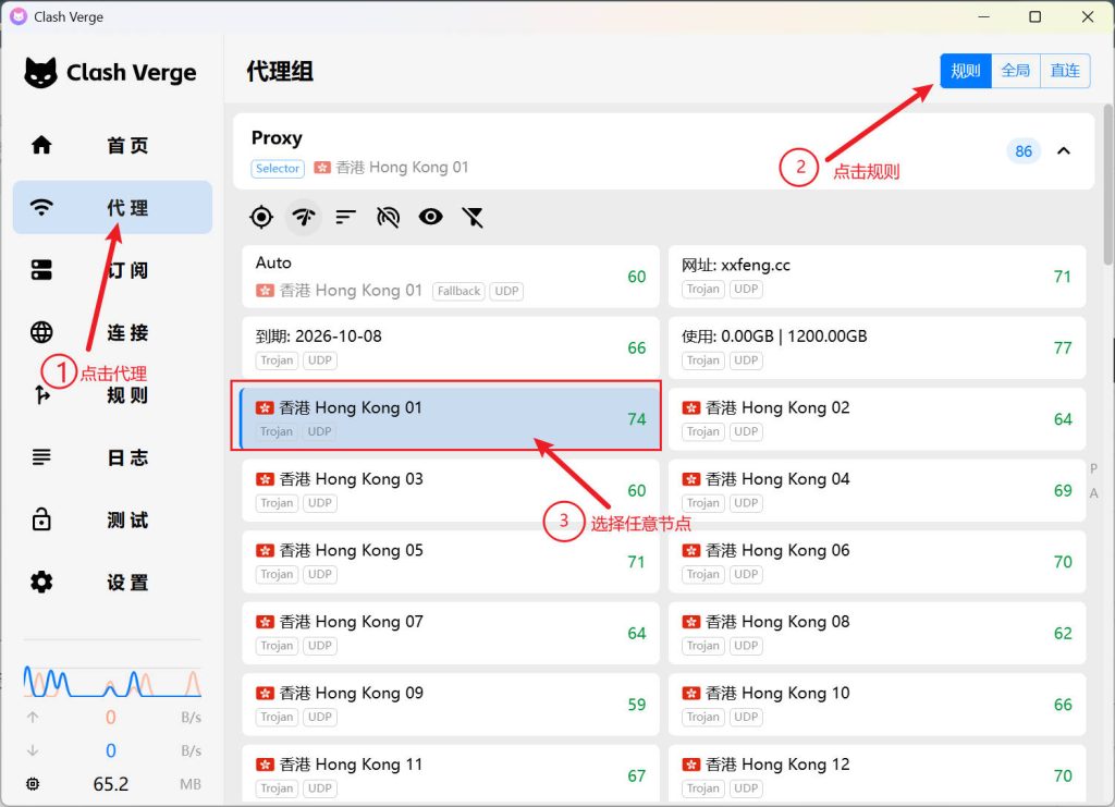 - 导入订阅后,点击左侧 “代理 / Proxies”