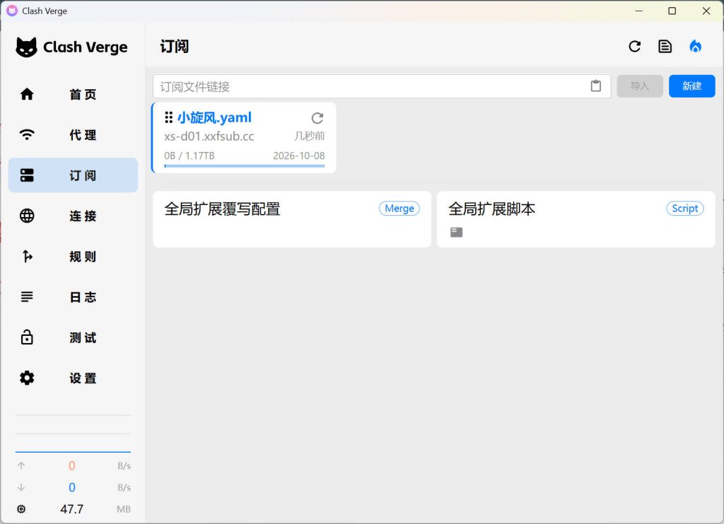 它支持订阅导入、节点选择、代理模式切换、TUN 虚拟网卡模式、系统代理守护、解锁测试、脚本扩展、配置合并等功能。
