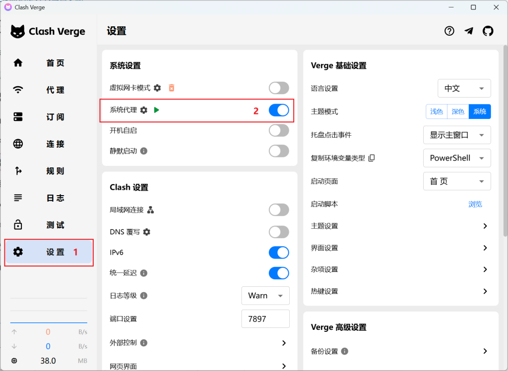 - 找到 “系统代理 / System Proxy” 开关,开启它即可使大多数应用走代理